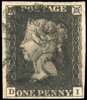 1840 1d Intense black Pl.1a. Used four margin example (DI) cancelled by a black MC. Scarce cancellation on this plate. Spec. AS1f. Cat £1100. Ex. Cawardine.