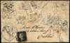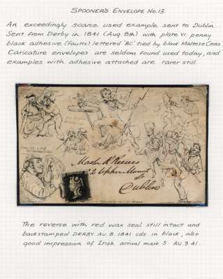1840 Spooner Envelope No.13. Used example sent from Derby to Dublin, bearing a 1d Black Pl.6. cancelled by a black MC. Adhesive bearing faults and lifted and replaced (Stamp not original). Backstamped in Derby AU.8.1841 and in Dublin the following day. Scarce.
