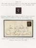 1840 1d Black Pl.8. Fine group of two examples, a single used our margin example (EC) cancelled by a red MC and a second example (KI) tied to a clean mourning wrapper by a red MC. An attractive pair. (2)