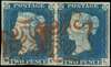 1840 2d Blue Pl.1. Used four margin horizontal pair (MK-ML) cancelled by orange-red MC's. SG5. Cat £2500.