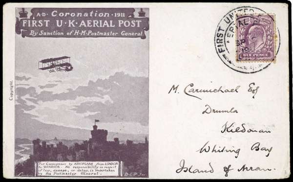 1911 First United Kingdom Aerial Post. Very fine used example of the London envelope in brown-lilac with a 1d Downey with a 6d Edward VII issue placed directly on top. Addressed Whiting Bay, Island of Arran and cancelled by FIRST UNITED KINGDOM/AERIAL POST LONDON datestamp for SP.9.1911. Die 4. Very rare used with an Edward VII issue. Most unusual. Some toning to perfortions.