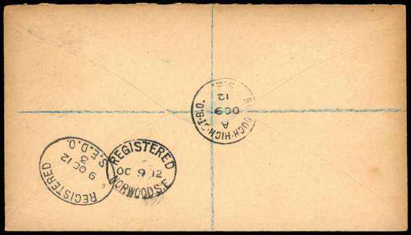 1912 3d Violet. Very fine used example tied to a plain 'Marsh' registered envelope by a crisp Borough High St. B.O. S.E. cds for OC.9.1912, the first day of issue. Attractive and scarce. SG375. Booth (31F) Cat £2,250.