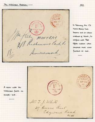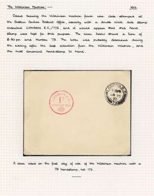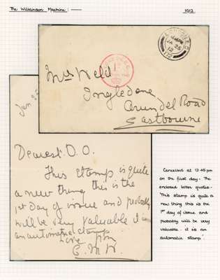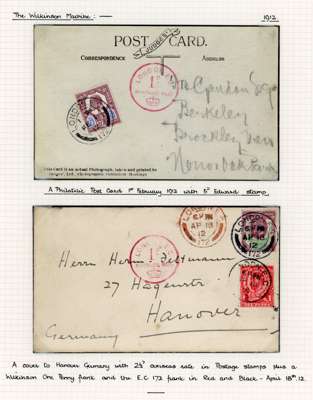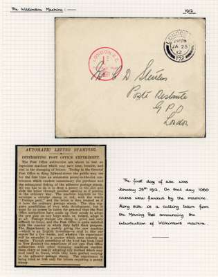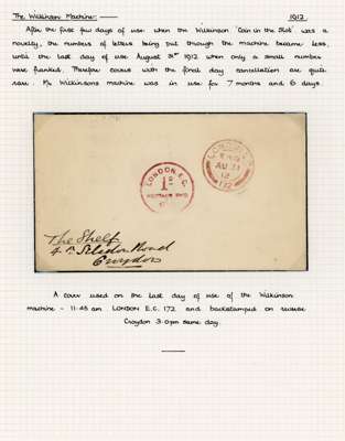 TRIAL CANCELLATIONS: 1912 Wilkinson Coin Fed Machine Cancel collection neatly displayed on album leaves including three used on the First Day of Use (JA.25.12), all with different time slots, four further envelopes, one uprated with additional stamps to Germany, and one postcard bearing KEVII 5d. A fine group. (8)