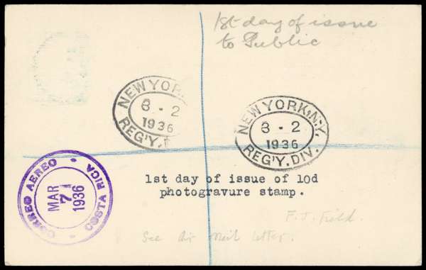1924 10d Turquoise-blue "Photogravure". Superb used example on registered postcard to San Jose, Costa Rica cancelled by a Northern District Office cds for the first day of issue FE.24.1936 with a Registered datestamp below for the same day and a London N.W. registration label at left. Super quality, very rarely seen so fine. Booth Cat £1000.