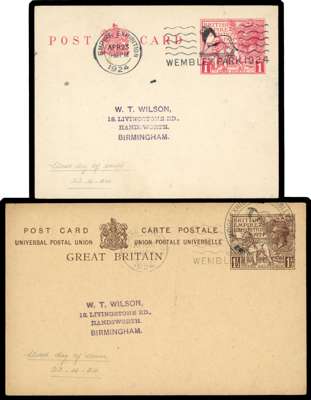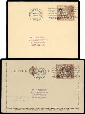 1924 1d & 1½d British Empire Exhibition. Very fine group of four first day exhibition postal stationery items addressed to ‘Wilson’ Birmingham from London including a 1d Postcard, 1½d UPU Postcard, 1½d lettercard and 1½d printed envelope all cancelled by a Empire Exhibition machine slogan cancellations AP.23.1924. the first day of issue. Booth Cat £750.
