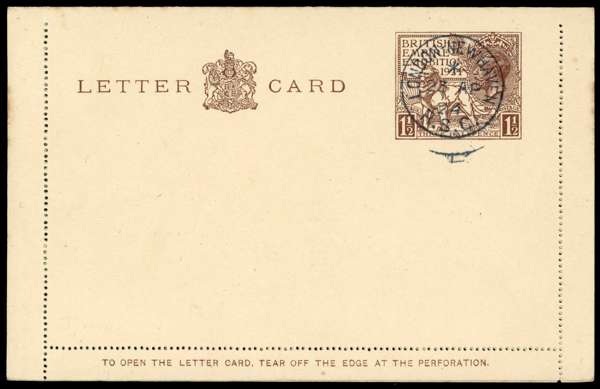 1924 1d & 1½d British Empire Exhibition. Very fine group of three exhibition postal stationery items all unaddressed. including a 1d Postcard, 1½d UPU Postcard and a 1½d lettercard. All cancelled by London New Haven cds' for AP.23.1924. the first day of issue. Booth Cat £600.