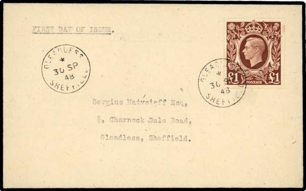 1948 £1 Brown "Arms" High Value. Superb envelope sent locally within Sheffield tied Gleadless Sheffield cds' for the First Day of Issue OC.1.1948. Scarce so fine. SG478b.
