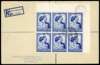 1948 £1 Royal Silver Wedding. Very fine registered envelope bearing a top right hand corner marginal block of six £1 (SG494) tied by Cheltenham cds' for the first day of issue AP.26.1948. and a Cheltenham Registered oval for the following day. Scarce positional multiple. SG494.