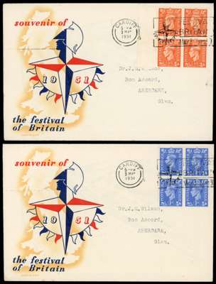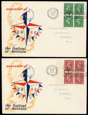 1951 (3 May) New Colours ½d to 2½d set of five in block of four used on individual illustrated first day covers cancelled with Festival of Britain Cardiff slogan. Fine and scarce. SG 503/7