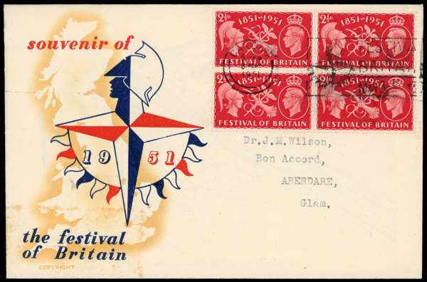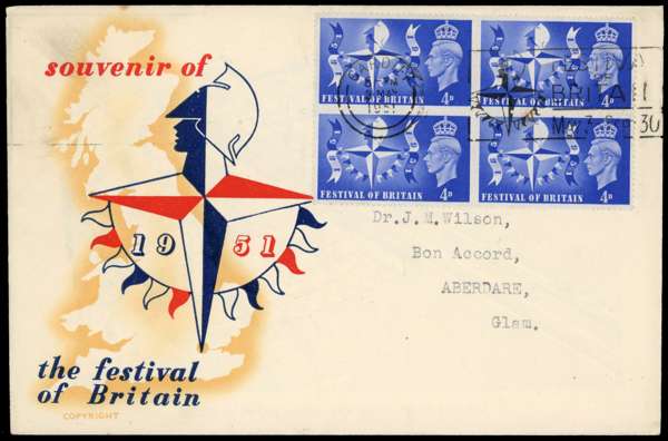 1951 Festival of Britain. Very fine used set of two blocks of four on an illustrated envelope cancelled by a Cardiff Festival of Britain cancellation for MY.3.1951 First day of issue. Very rare. Booth Cat £425++.