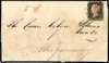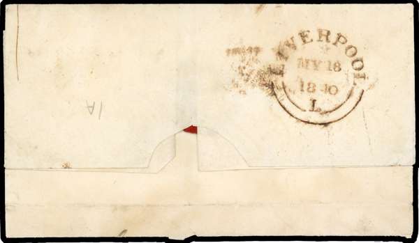 1840 1d Black Pl.1a. “May Date”. Fine wrapper sent from Liverpool to Abergavenny bearing a four margin 1d Black Pl.1a. (FC, Significant plate wear) tied by a reddish-brown MC with a matching Liverpool datestamp on reverse for MY.18.1840. significant damage at foot yet a presentable cover. SG3, Spec. AS3th. Cat £2500.