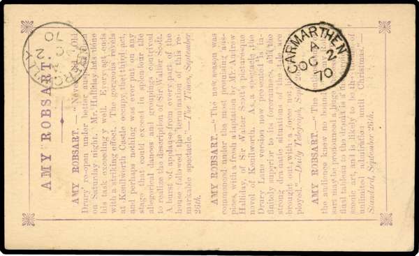 1870 ½d Violet postcard (Small format). Very fine used example sent from London to Abergwili, Carmarthen cancelled by a crisp London cds for the first day of issue OC.1.1870. and on reverse upon arrival for the following day. Scarce. Booth spec 9b, Cat £800.
