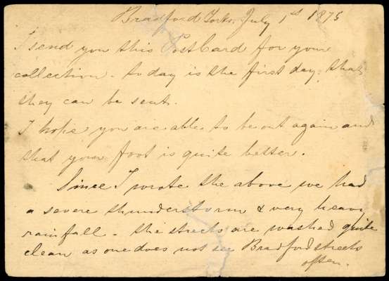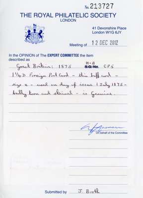 1875 1½d UPU Foreign Postcard. Fine used example sent from Bradford to Aachen cancelled by a the cds section of a Bradford duplex for the first day of issue JY.1.187F. Damage at top and bottom and staining at left yet a very rare postal stationary fdc. Booth spec 10a, Cat £2500. 2012 RPS Cert.