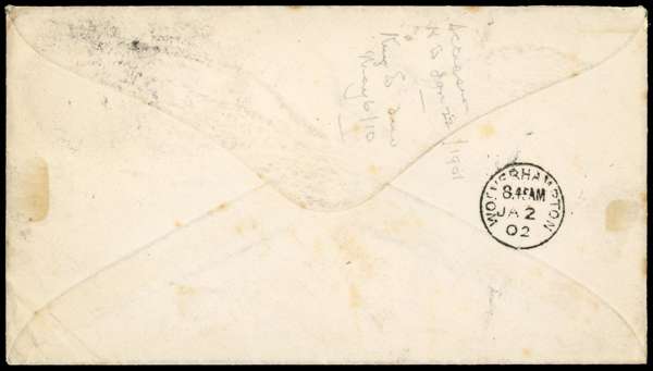 1902 Hand illustrated First Day cover. Very fine part printed and ornately addressed/illustrated in red and black bearing a ½d blue-green (SG216) and a 1d Scarlet (SG219) both neatly tied by Sleaford datestamps for the first day of issue JA.1.1902. An attractive and unusual first day cover.
