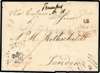 1819 pre-stamp/Incoming Registered Mail. Very fine wrapper sent from Frankfurt to London via Calais bearing a transit datestamp at right for SP 12 1819. two ‘CHARGE’ handstamps and a red ‘REGISTERED' CROWN handstamp (Jay L1127, previously recorded in use between 1820-32 in this colour). Bearing two F.P.O. dotted London datestamps for SE 27 1819 on reverse. Rare cancellation and the earliest recorded example of this Registered handstamp. Ex Willcocks.