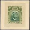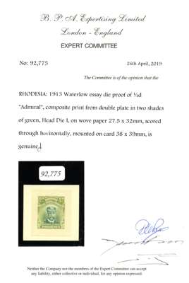 1913 ½d Die Proof in trial colours, two shades of green, 27 x 32mm mounted on card 38 x 39mm. Horizontally scored, as usual. Rare. BPA Certificate (2019). For SG 186