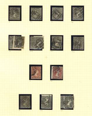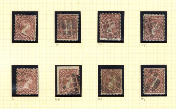 1885-91 used collection with sideways watermark 1d x 8, including all watermark variants, and 4d x 10 with all watermark variants plus a couple of duplicates. Upright watermark pair (4d poor) plus 1d reversed watermark (part registered crayon line), 4d watermark inverted and watermark reversed (2). Various cancels, some natural straight edges, an unusually comprehensive group with numerous good stamps. SG 7-12X
