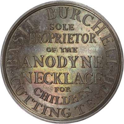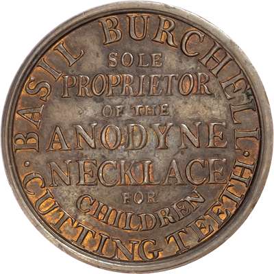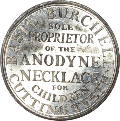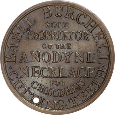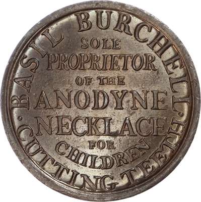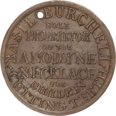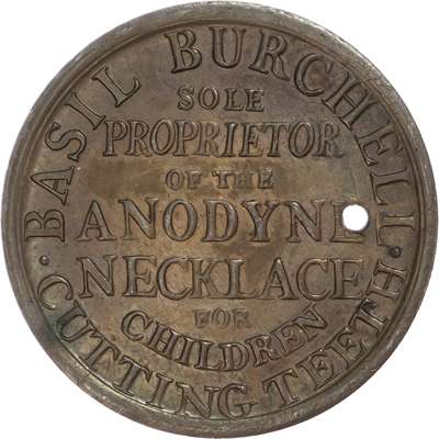 London - Longacre, Basil Burchell (medicine seller) Advertising Halfpenny undated, as last, copper and holed, 28.75mm/8.5gm (DH 270). Another variant but copper and unholed, 29mm/8.2gm. (DH 271). Another the same but white-metal, 29mm/8.03gm. (DH 271). Another variant, copper and unholed, 28.5mm/7.82gm. (DH 272). Another the same but holed, 29mm/7.95gm. (DH 272). Another variant copper and unhauled, 29mm/10.78gm. (DH 273). Another the same but holed, 29mm/11.62gm. (DH 273). Another similar but with edge THIS IS NOT A COIN BUT A MEDAL, 29mm/8.95gm. (DH 274). All Extremely Fine or better, DH 271, copper and white‑metal particularly so ‑ proof‑like, last with lustre, all scarce. [8]