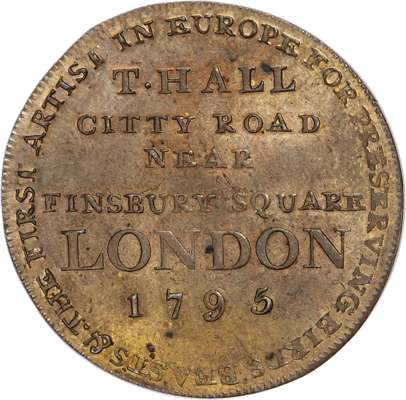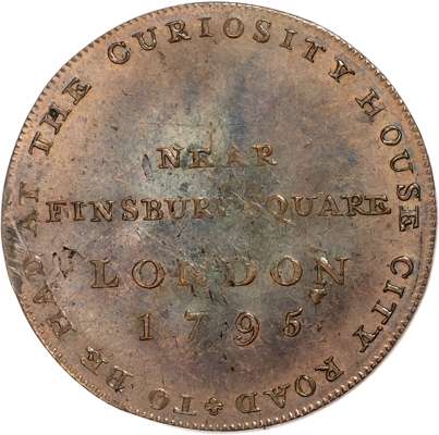 the Finsbury square address as above, edge diagonally milled, 21mm/11.29gm. (DH 315). Another the same but edge rounded plain, 21mm/8.6gm, (DH 315c). Another the similar but with misspelled ‘Citty Rd.’ rev., 30.75mm/9.06gm. (DH 316). All Extremely Fine or better, first and third with more than a trace of lustre. [3]