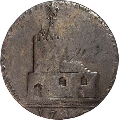 London - Hendon, Benjamin Price, Skidmore’s Farthing (struck from halfpenny dies) 1794, Bust left of David Garrick of Hendon Hall, rev. Hendon parish church, edge plain (not filed down) 24mm/5.98gm. (DH 1059 bis). Only Very Fine but very possibly unique.