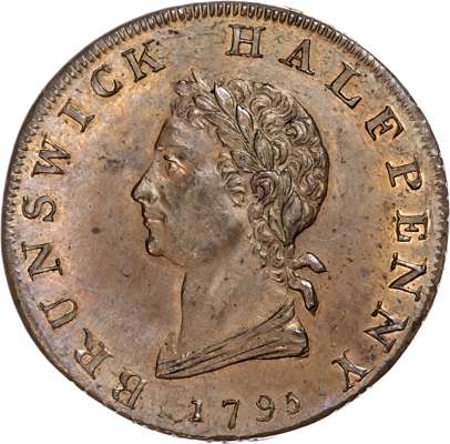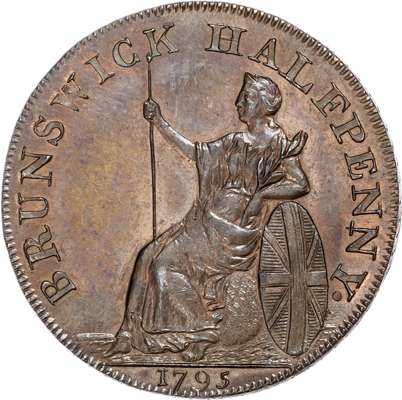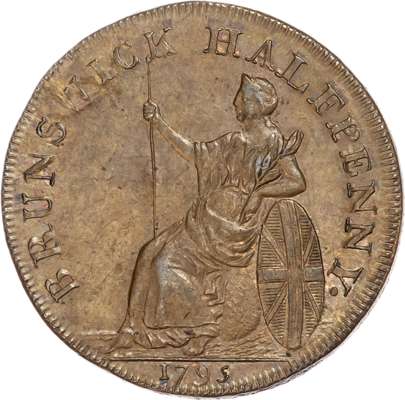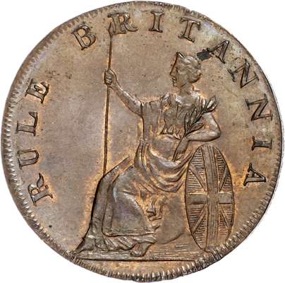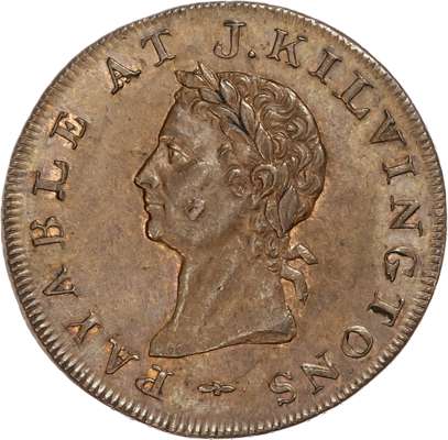 London – Drury Lane, John Kilvington (grocer & tea dealer), Halfpenny 1795, Laureate head left, rev. Britannia seated left, edge engrailed, 29mm/9.22gm. (DH 336). Another similar but small diff. in obv. leg. Spacing, 30mm/10.2gm. (DH 347). Another the same but edge PAYABLE IN DUBLIN OR LONDON .+.+.+., 29.25mm/9.16gm. (DH 349). All good Extremely Fine with iridescence and original lustre. [3]