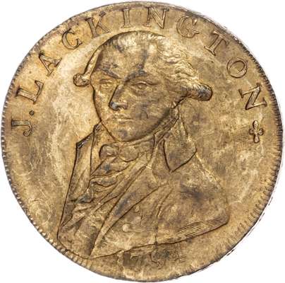Lackington’s half facing bust, rev. Fame blowing trumpet, edge diagonally milled, 28.5mm/9.78gm. (DH 351). Another similar but inner rev. leg. spaced differently and edge PAYABLE AT LACKINGTONS & CO FINSBURY SQUARE + LONDON (blundered), 29.25mm/10.80gm. (DH 352). Another but Fame larger and Allen’s name added on rev. and edge PAYABLE AT THE TEMPLE OF THE MUSES */*/*, 29mm/9.57gm. (DH 353), Another the same but edge HALFPENNY PAYABLE AT THE BLACK HORSE TOWER HILL, 29.5mm/9.35gm. (DH 353b), Another the same but edge diagonally milled, 29mm/11.05gm. (DH 353c). DH 353b Extremely Fine but cleaned and very rare ‘RR’, rest Extremely Fine to good Extremely Fine with traces of lustre. DH 353c also very rare ‘RR’. [5]