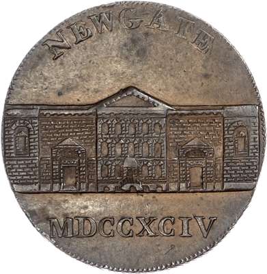 Kempson’s uniface obverse die trial Halfpenny 1794, View of prison façade, rev. blank, edge diagonally