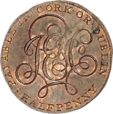 left, rev. JE & Co cypher (Cork 1), edge plain, 29mm/9.06gm. (DH 407). Another Skidmore Irish mule