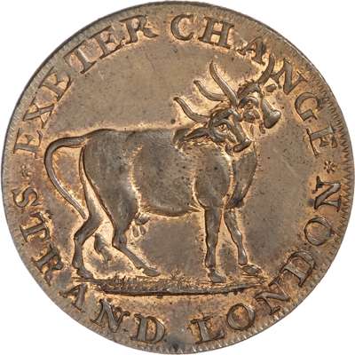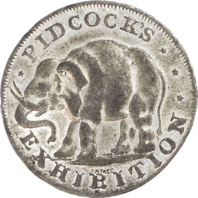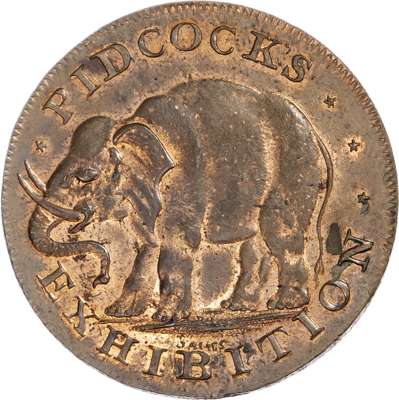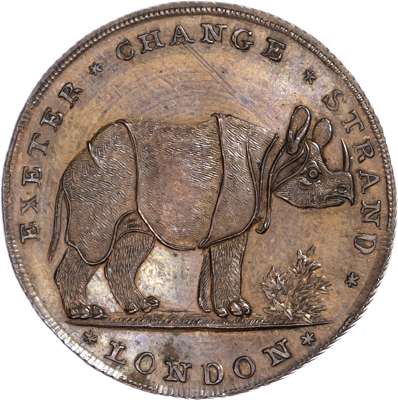 London - Strand, Gilbert Pidcock Halfpenny undated, African elephant standing left, rev. Rhinoceros standing right, edge diagonally milled, 29mm/9.54gm. (DH 416a). Another but rev. a two-headed cow, 29.5mm/10.08gm. (DH 422). Another the same but in white-metal, 29.75mm/7.55gm. (DH 422). Extremely Fine, second better with almost full lustre, last scarce. [3]