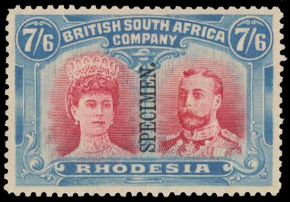 7/6d carmine and light blue SG 161 overprinted SPECIMEN, large part o.g. Position 46 King's extra curl, fresh and rare