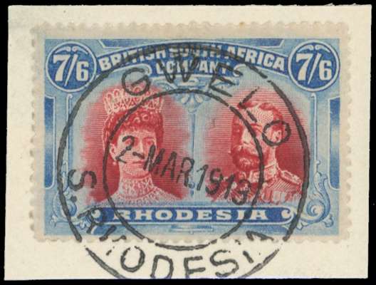 GWELO DC 2 MAR 1916 on 7/6d deep rose-red/carmine-red and dull/new blue (RSC D variant ii), a virtually complete strike on piece