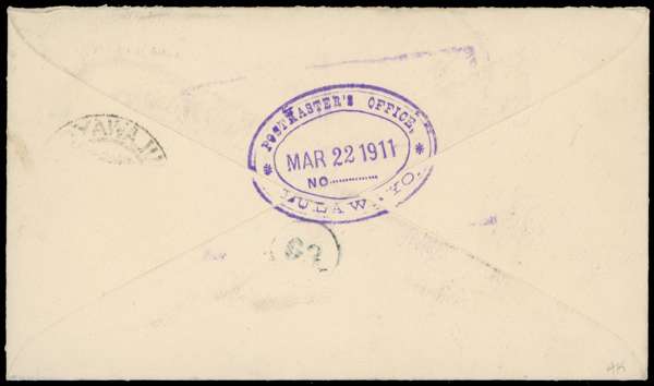 ½d single and pair in a bright deep green shade, uprating a 1d embossed postal stationery envelope to Germany. Bulawayo DCs of 22 MAR 11. The reverse with Postmaster's cachet of the same date. Clean and attractive. SG 119 group