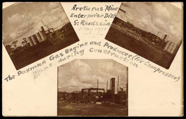 The picture side of the card is of considerable interest with three small views of Arcturus Mine in May 1911, showing 'The Paxman Gas Engine and Producer (Air Compressor) Plant during construction'