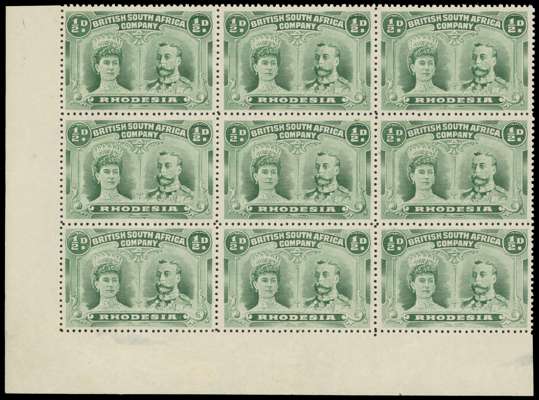 ½d dull blue-green lower left corner block of nine (positions 71-93), position 82 with ‘bomb’ flaw. Stamps unmounted, the selvedge with some faults, still a fine multiple. SG 120, RJL 5