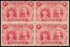 1d bright carmine block of four, positions 28-39. Position 28 ‘bruise’ mark right of King's ear. O.g., hinged on top pair only. SG 123