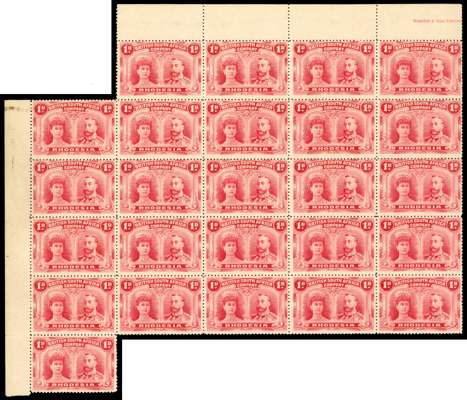 1d bright carmine irregular block of twenty-five, with part imprint. Positions 2-5, 11-41 and 51. O.g., hinged on the selvedge only, fine. SG 123