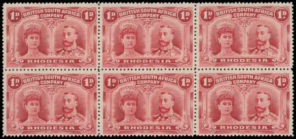 1d deep carmine block of six, positions 44-56A. Large part o.g., with 45, 54 and 56 unmounted. Fine colour. SG 124 group