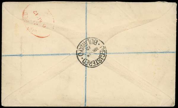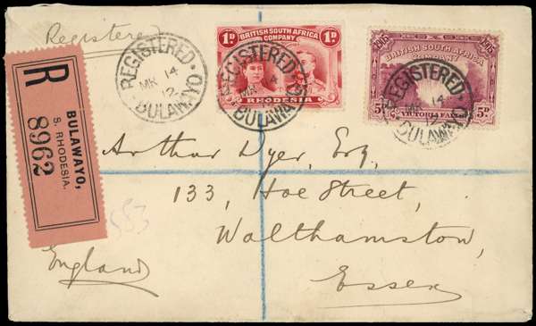 1d carmine-red and 5d Falls on registered Dyer envelope from Bulawayo to Essex, Registered Bulawayo SCs of MR 14 12. Neat