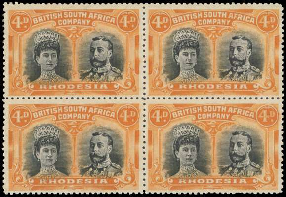 4d black and orange block of four, Hook plate, positions 43-9. Position 44 with a patch of missing gum and some disturbance, the other three unmounted o.g. Positions 43 printer's mark, 48-9 roller die flaws. RSC B