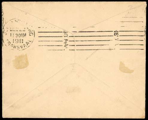 1911 (19 DEC) unsealed cover from Bulawayo to Johannesburg, franked at the open letter rate by 1910-13 ½d yellow-green (SG 119, RJL 1) tied by 'BULAWAYO / S. RHODESIA' cds (Proud type D25) with additional strike alongside and Johannesburg roller cancel (DEC 22) backstamp, a fine and rare usage.