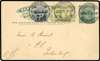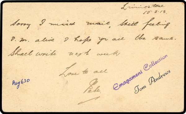 1913 (15 MAR) ½d green 'Arms' post card, addressed to Ficksburg, Orange Free State, and franked by 1909-11 7½d on 2s6d bluish grey (SG 116) and 1910-13 ½d olive-green (SG 121, RJL 3), tied by three superb strikes of ‘LIVINGSTONE / N.W. RHODESIA’ cds, small split at foot and owner's h/s on reverse ('Emagameni Collection / Tom Andrews') otherwise fine and scarce.