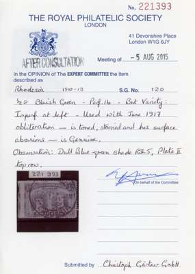 1910-13 ½d bluish green, perf 14, the right stamp of a horizontal pair (portion of adjoining stamp at left) error IMPERFORATE AT LEFT, cancelled by large part ‘SALISBURY / S. RHODESIA’ cds dated ‘11 JUN 17’. Faintly toned nevertheless a remarkable and extremely important stamp of the highest rarity which proves that at least one ½d sheet existed lacking a row of vertical perforations. RPS cert (2015). SG 120 var, RJL 5 var