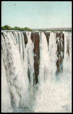 1912 (DE 2) ppc ('Victoria Falls') addressed to England, franked by 1910-13 ½d apple-green (RJL 6) horizontal pair, tied by individual fine to very fine strikes of ‘VICTORIA FLS / S. RHODESIA’ single-ring cds (Proud type D4), a fine and scarce usage.
