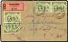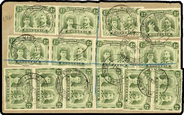 1914 (20 JAN) registered cover from Headlands to Ladybrand, South Africa, franked at 9d by no fewer than 18 examples of 1910-13 ½d emerald-green (RJL 8) incl several pairs and strips, with four examples on the front and the remainder covering the reverse, all tied by ‘HEADLANDS / RHODESIA’ cds with registration label at upper left; slight imperfections as to be expected, nevertheless a highly unusual and rare franking.