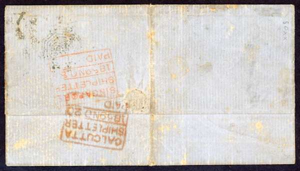 1859 (NO 8) entire from Singapore to Calcutta, endorsed “per Australian” and franked by 1855 4a black/blue glazed, BISECTED DIAGONALLY, tied by “B-172” octagon with, on reverse, “SINGAPORE / SHIP LETTER / 1859 NO.8 / PAID” despatch and “CALCUTTA / SHIP LETTER / 1859 NO.20 / PAID” boxed ds in red; vertical filing fold and other slight imperfections nevertheless a very rare and important exhibition item, being one of four known 4a bisect covers to India of which only TWO are on blued paper. Ex P.H. Tay (Feldman 11 Nov 1986, lot 60121). SG Z68a, £22,000+