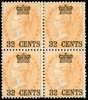1867 (1 Sep) 32c on 2a yellow, block of 4, large part o.g.; some short perfs at right and the upper right stamp with corner crease and surface blemish, but a rare multiple. SG 9, £2400