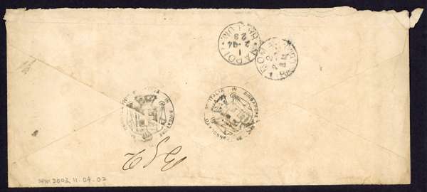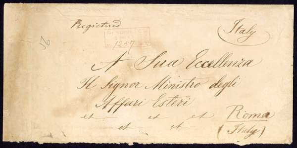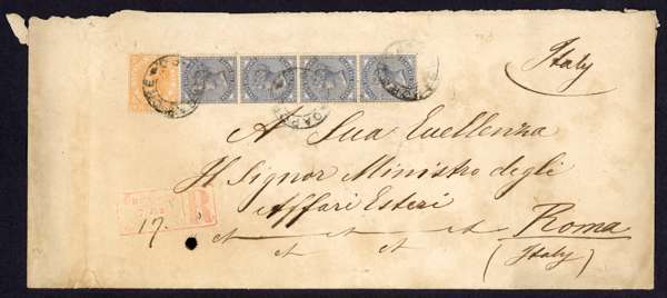 1883 (3 Dec) and 1884 (7 Jan) envelopes (253x123mm; slightly toned and creased) from the Italian Consul in Singapore (cachet on reverse) to the Italian Foreign Office in Rome, the former bearing (on reverse) 1882 10c slate vertical strip of 3 and pair and 1883-91 2c rose block of 3, the latter bearing 1882 8c orange and 10c slate vertical strip of 4, all tied by undated “SINGAPORE / P.O.” h/s and showing red registration datestamp, the former cover additionally with disinfection slits. An interesting pair of covers, disinfected mail from the Straits Settlements is unusual. Ex Spink Singapore (21 Jun 2003, lot 58).