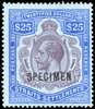 1912-23 $25 purple and blue/blue, wmk MCA, opt ‘SPECIMEN’, fresh large part o.g. SG 213s, cat £650.