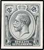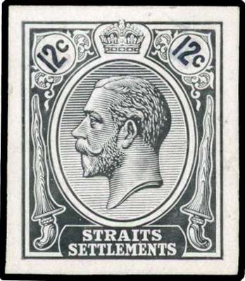 1921 (30 Sep) 12c stamp-size essay, comprising a cut-down 2c die proof with value tablets overpainted in Chinese white and figures ‘12’ inserted, endorsed on reverse ‘figure 2 removed and 12 painted in by hand’ and ‘app 30.9.21’, fine and rare.