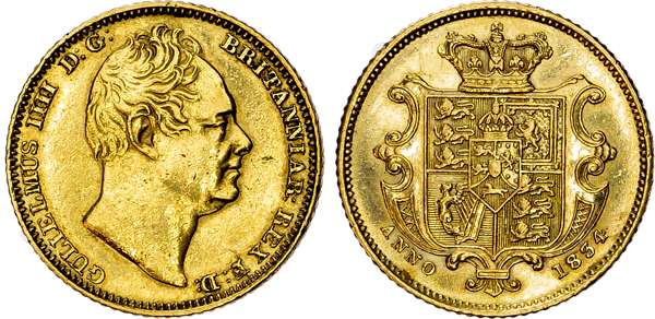 William IV (1830-37), Half-Sovereign, 1834, Small Size, head right, rev. crowned shield, Marsh 410 ‘R2’; MCE 495; S.3830…